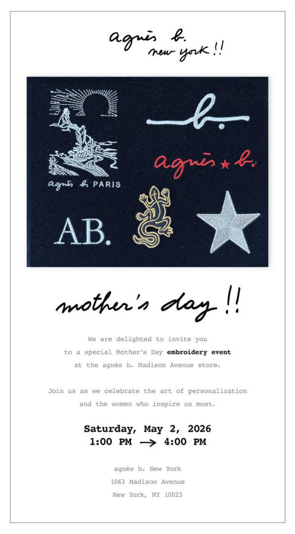 We are delighted to invite you to a special Mother’s Day embroidery event at the agnès b. Madison Avenue store.
