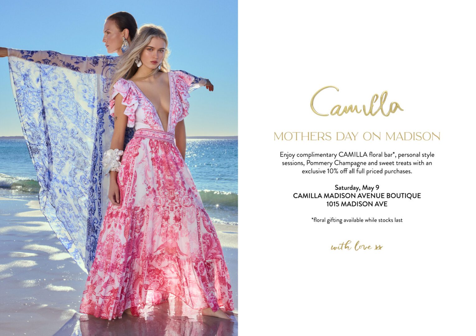 Celebrate Mother’s Day at CAMILLA with complimentary florals with each purchase*, personal style sessions, Pommery Champagne and sweet treats with an exclusive 10% off all full priced purchases. With love . . .